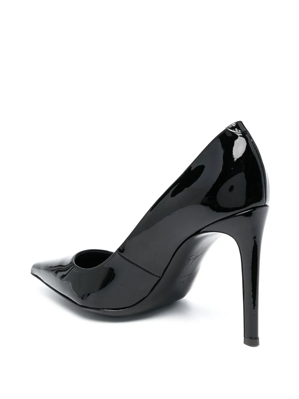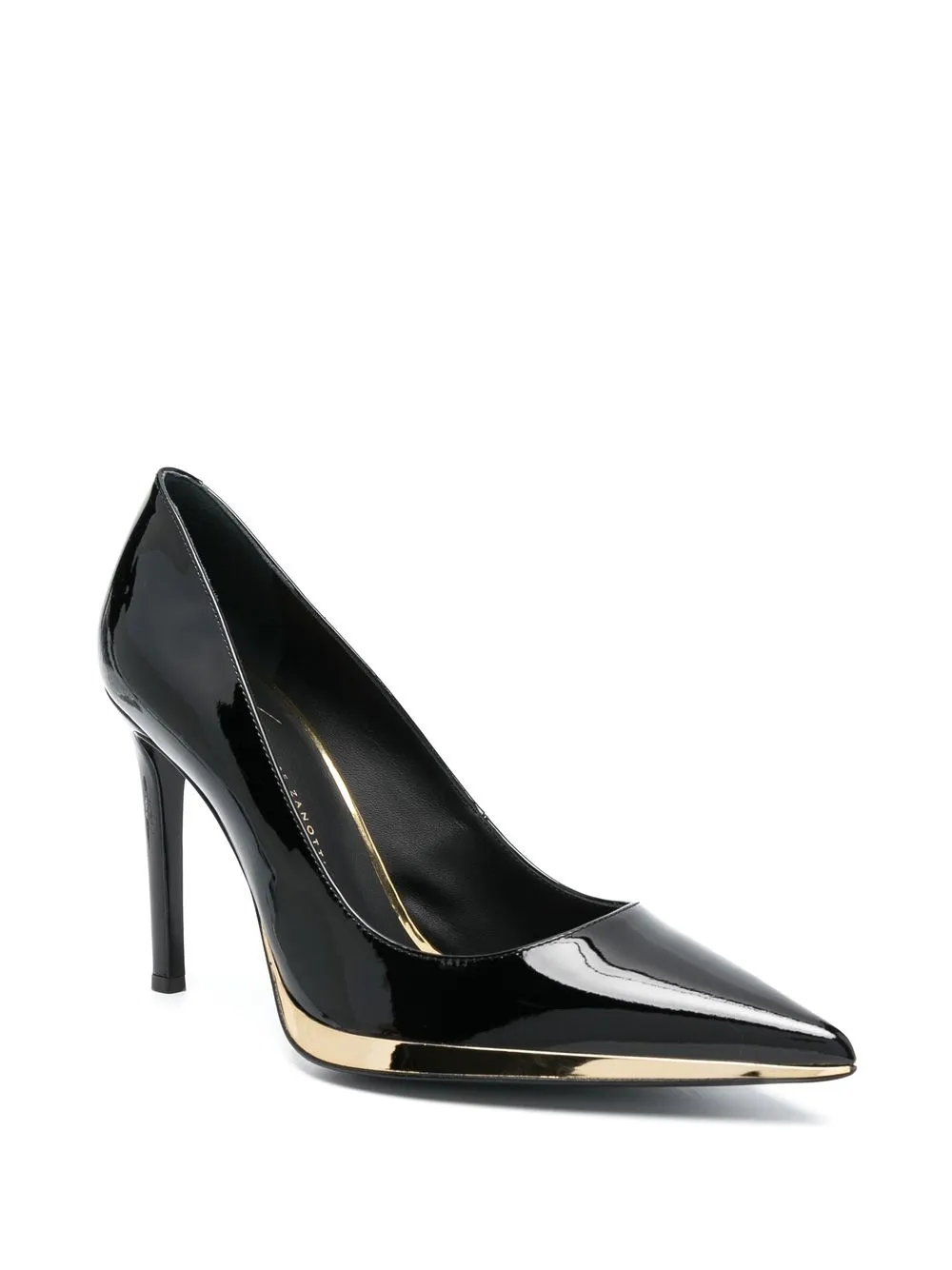 metallic-finish 95mm pumps from Giuseppe Zanotti featuring metallic finish, slip-on style, pointed toe, high heel, branded insole, black and patent leather.