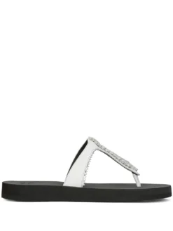 Orsola crystal-embellished flip-flops from Giuseppe Zanotti featuring off-white, black, leather, crystal embellishment, open toe, slip-on style, branded insole and flat rubber sole.
