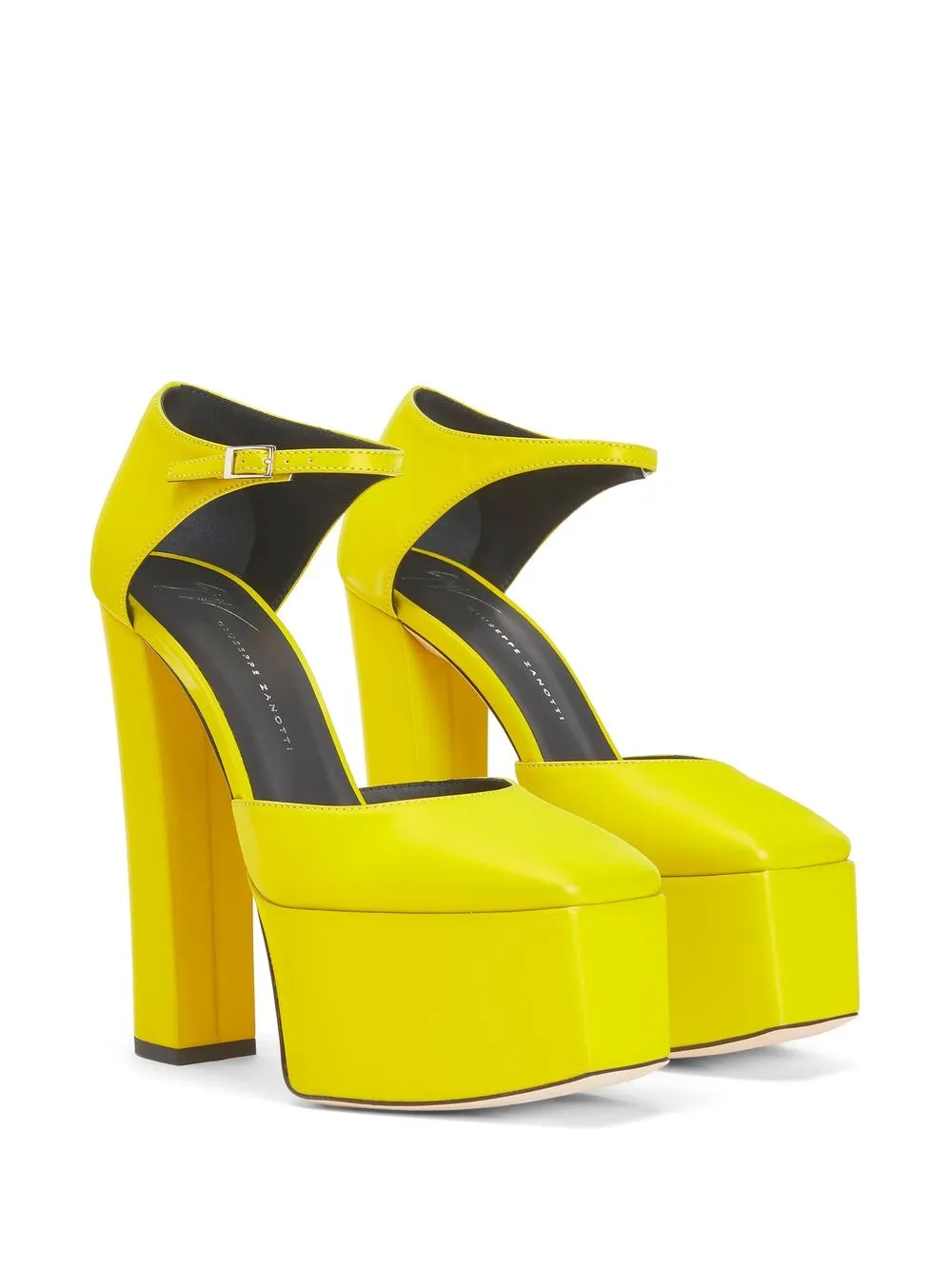 platform square-toe pumps from Giuseppe Zanotti featuring yellow, satin finish, buckle-fastening ankle strap, square toe, high block heel and platform sole.