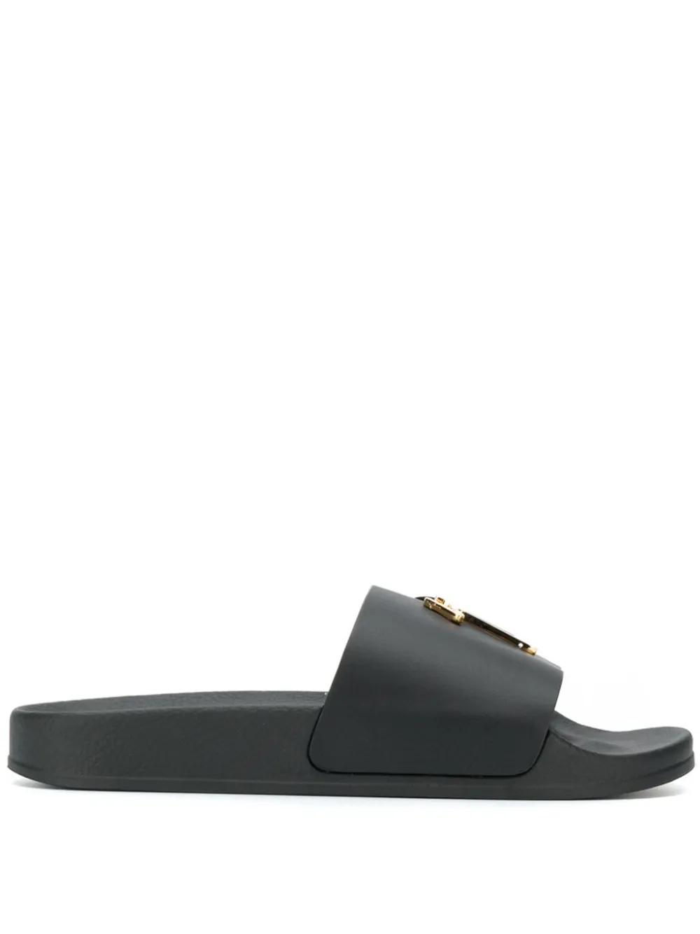 Guiseppe Zanotti Design creates boundary pushing footwear for connoisseurs of flawless construction, as showcased by these black leather Signature slides. Featuring an open toe, a flat rubber sole and a gold-tone signature plaque to the front.