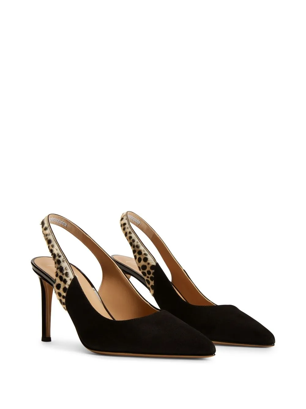 Susie Feline 85mm slingback pumps from Giuseppe Zanotti featuring black, sand beige, suede, pony hair, leopard print, pointed toe, slingback strap, branded insole and high stiletto heel.