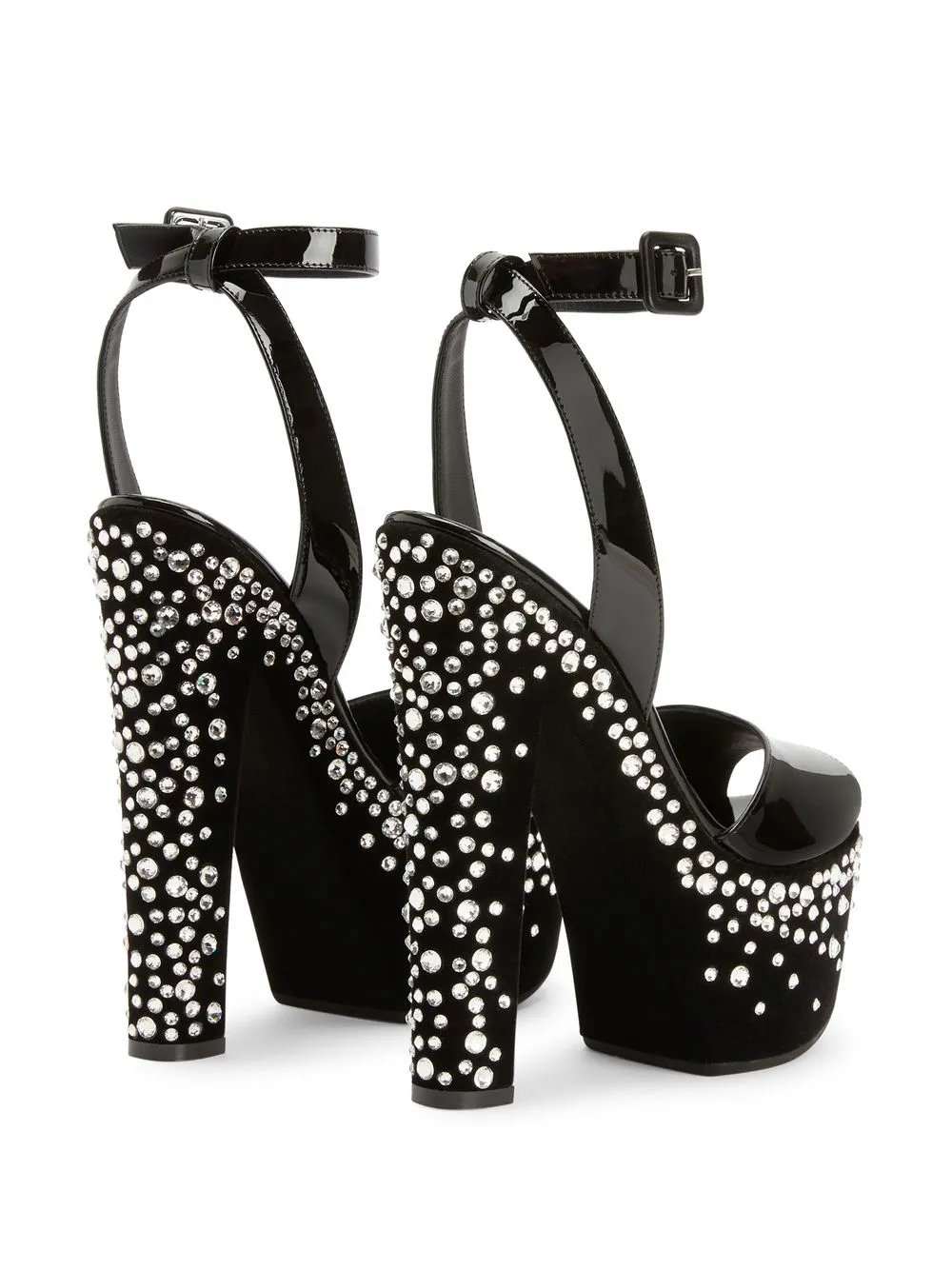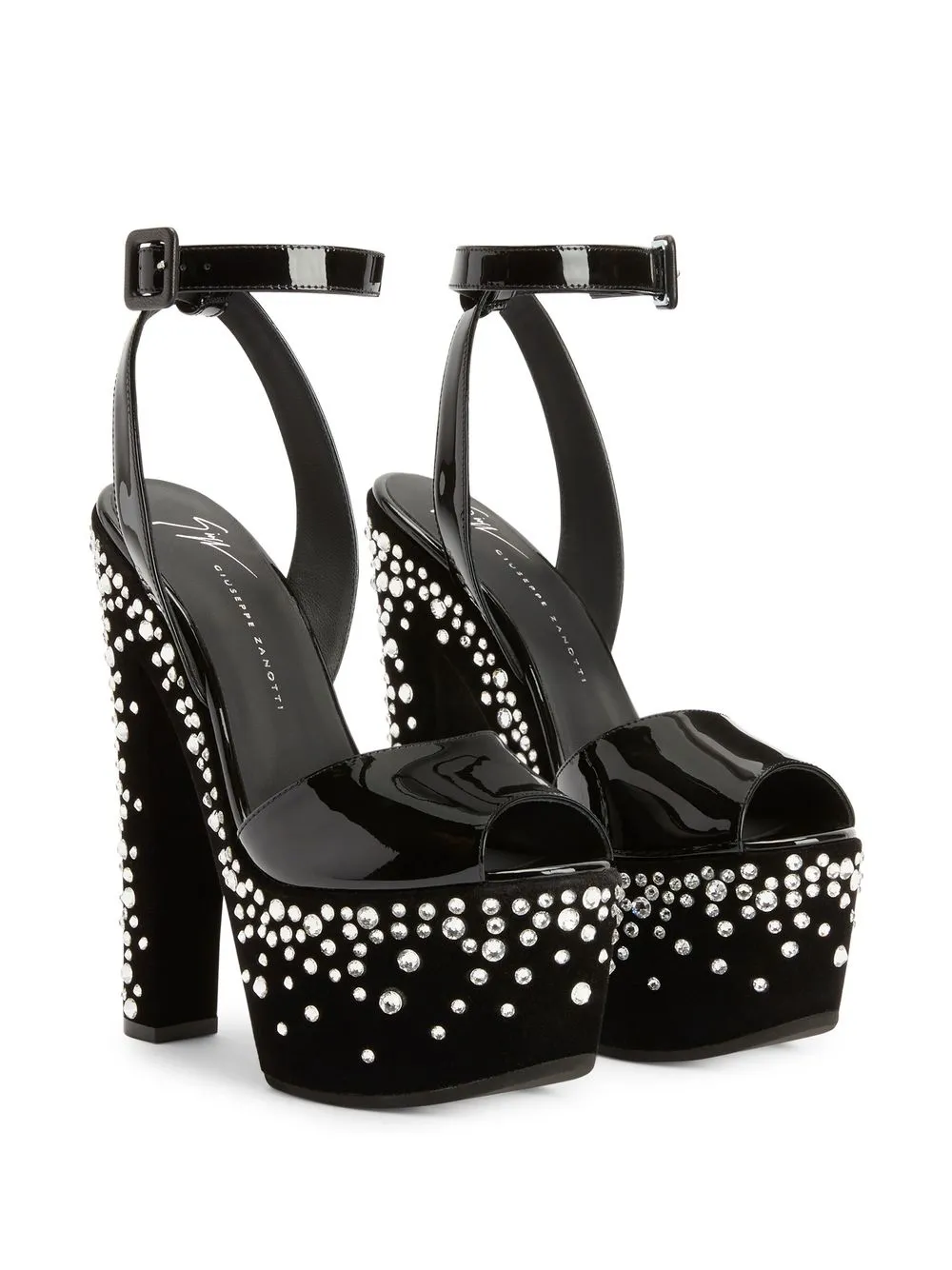 Tarifa Jewel 170mm platform sandals from Giuseppe Zanotti featuring black, leather, velvet effect, crystal embellishment, open toe, platform sole, branded insole, buckle-fastening ankle strap and 170mm heel.