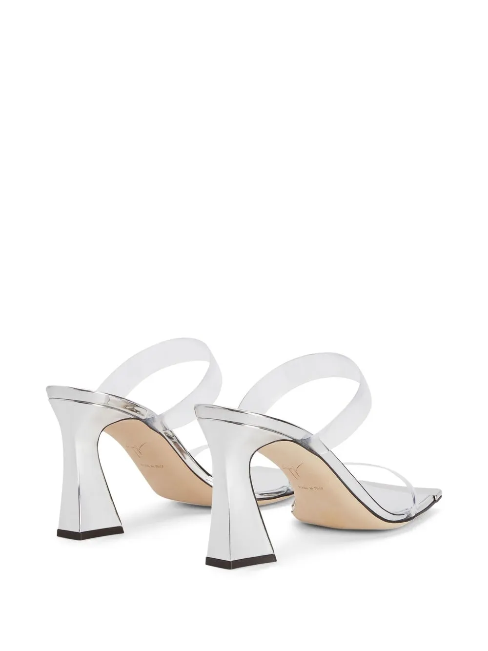 transparent block-heel mules from Giuseppe Zanotti featuring silver, leather lining, transparent design, branded insole, open toe, slip-on style, double-strap design and high block heel.