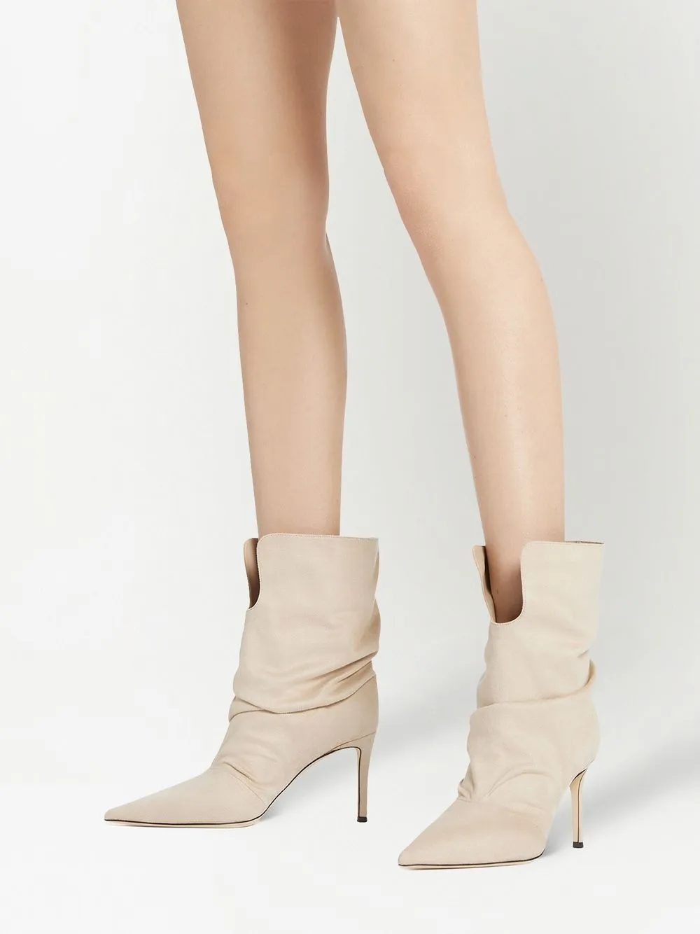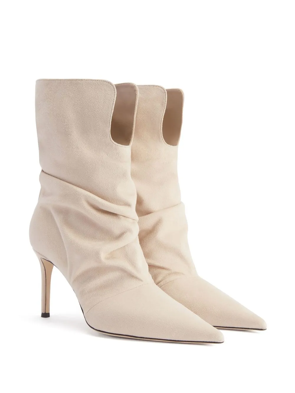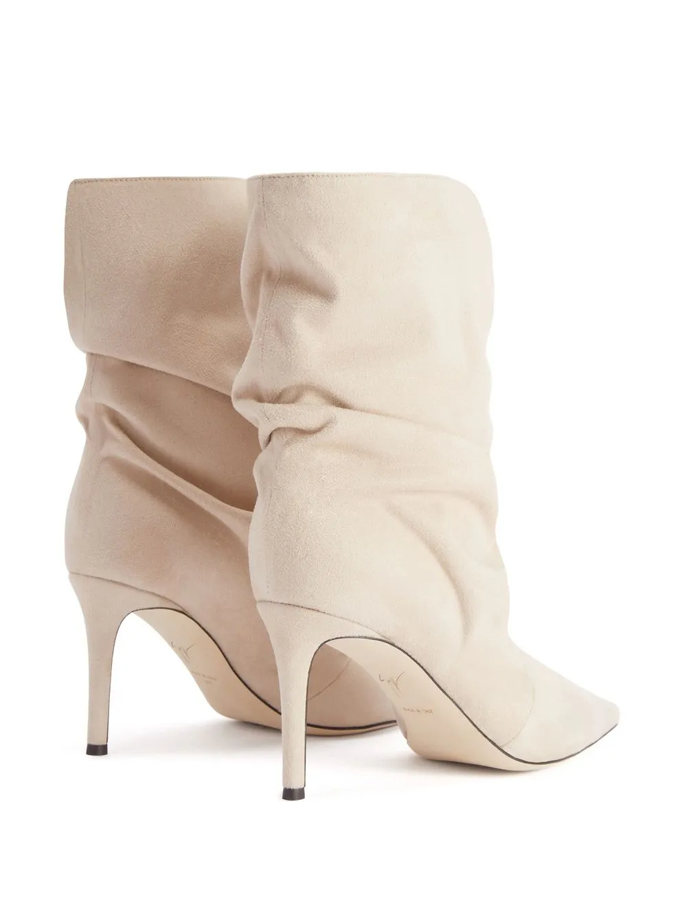 Yunah suede 85mm ankle boots from Giuseppe Zanotti featuring light beige, suede, leather, gathered detailing, pointed toe, pull-on style and 85mm heel.